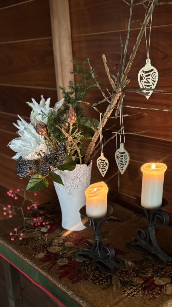 玄関のクリスマスのしつらえでお迎えします。